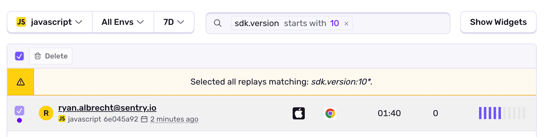 Alternatively, you can delete all replays that match a search query by clicking "Select all" at the top of the results list. This selects every replay matching the current filters, not just those visible on the page.